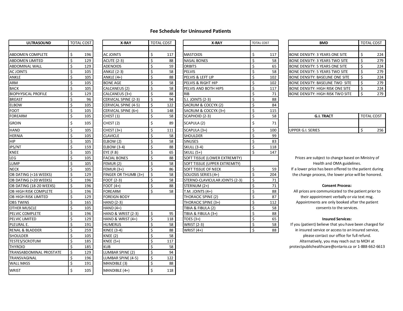 Patient Uninsured fee schedule