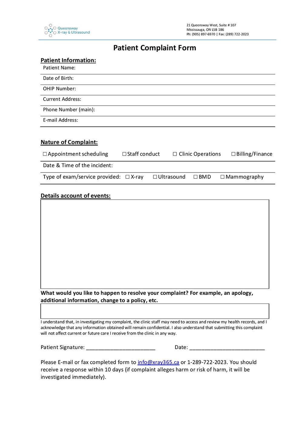 Patient complaint form
